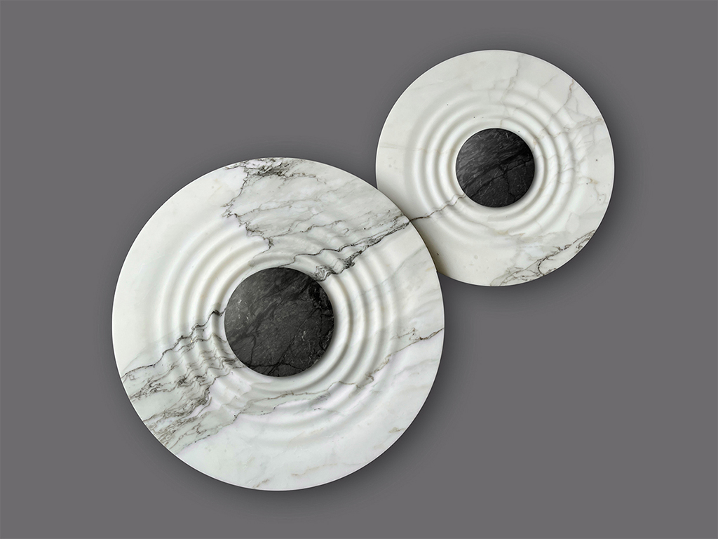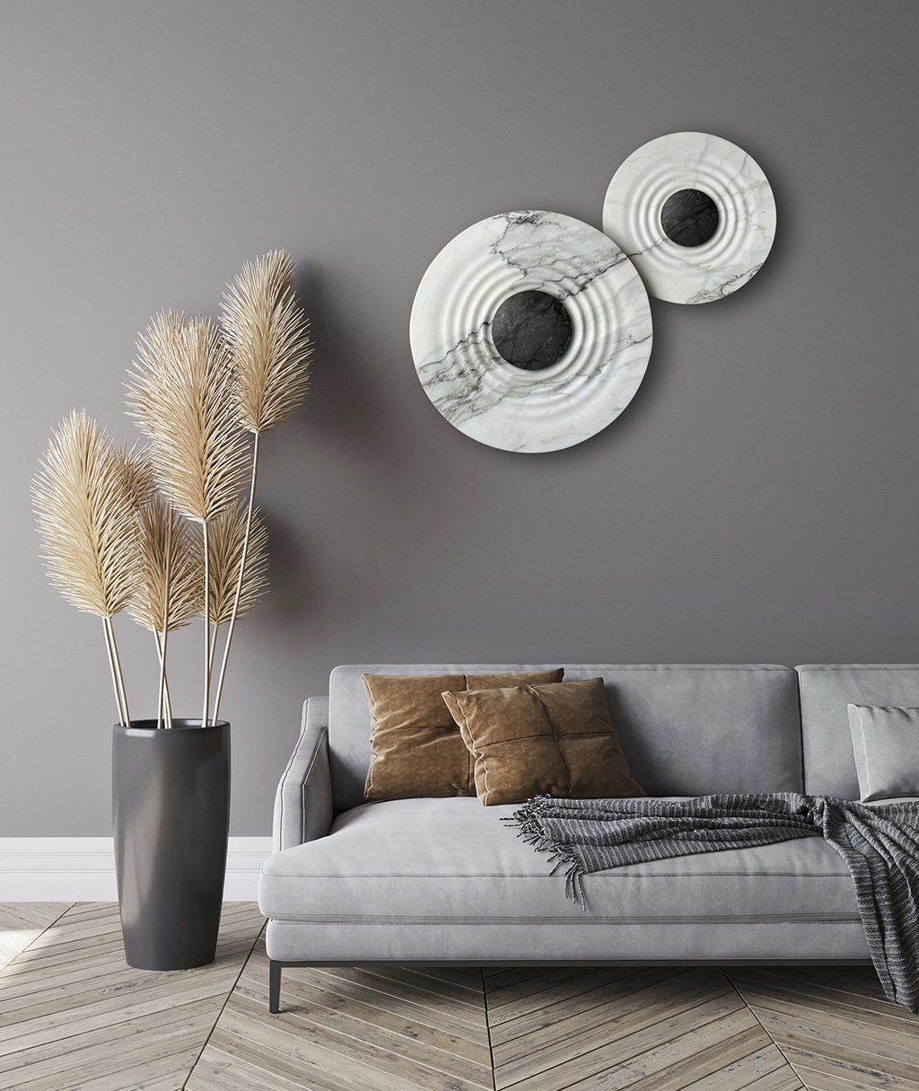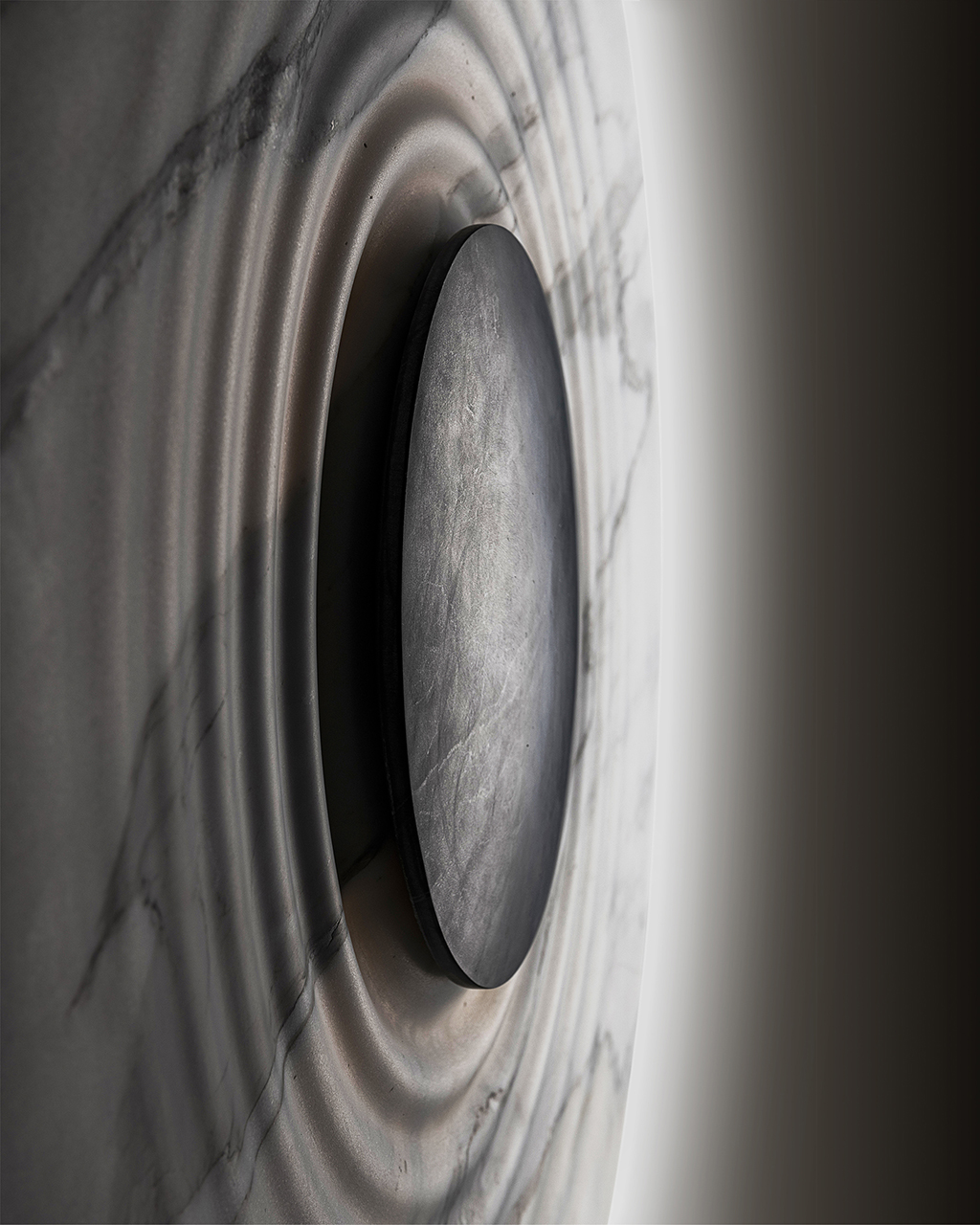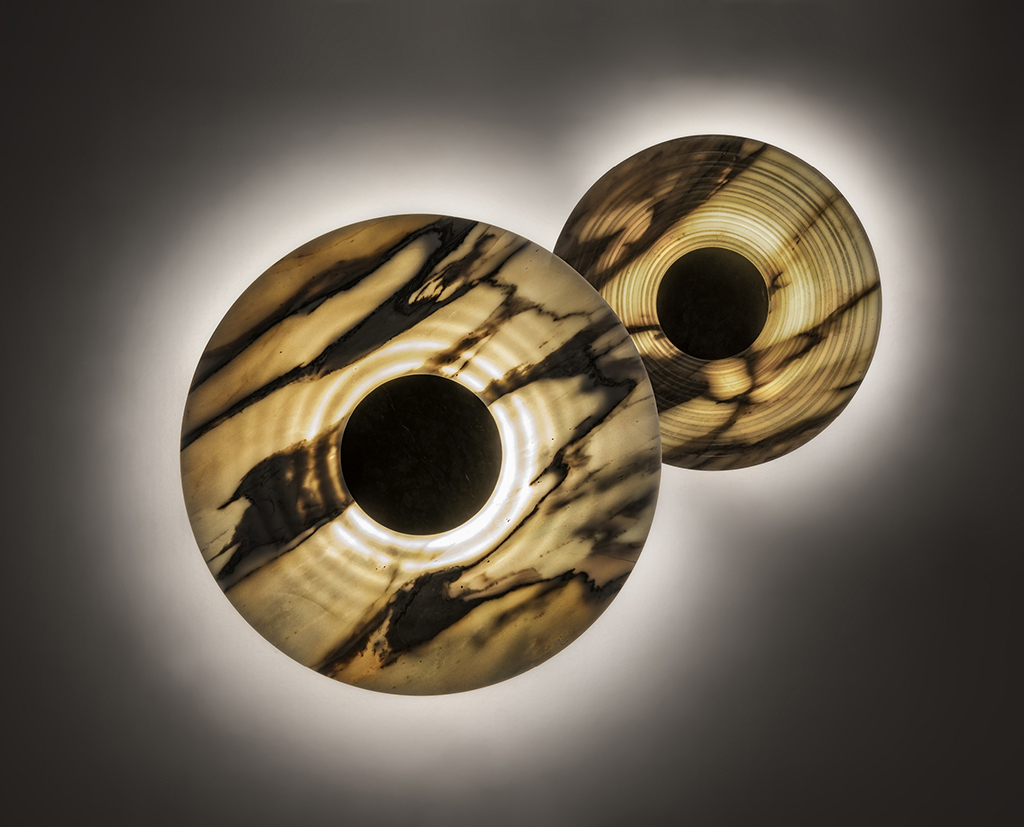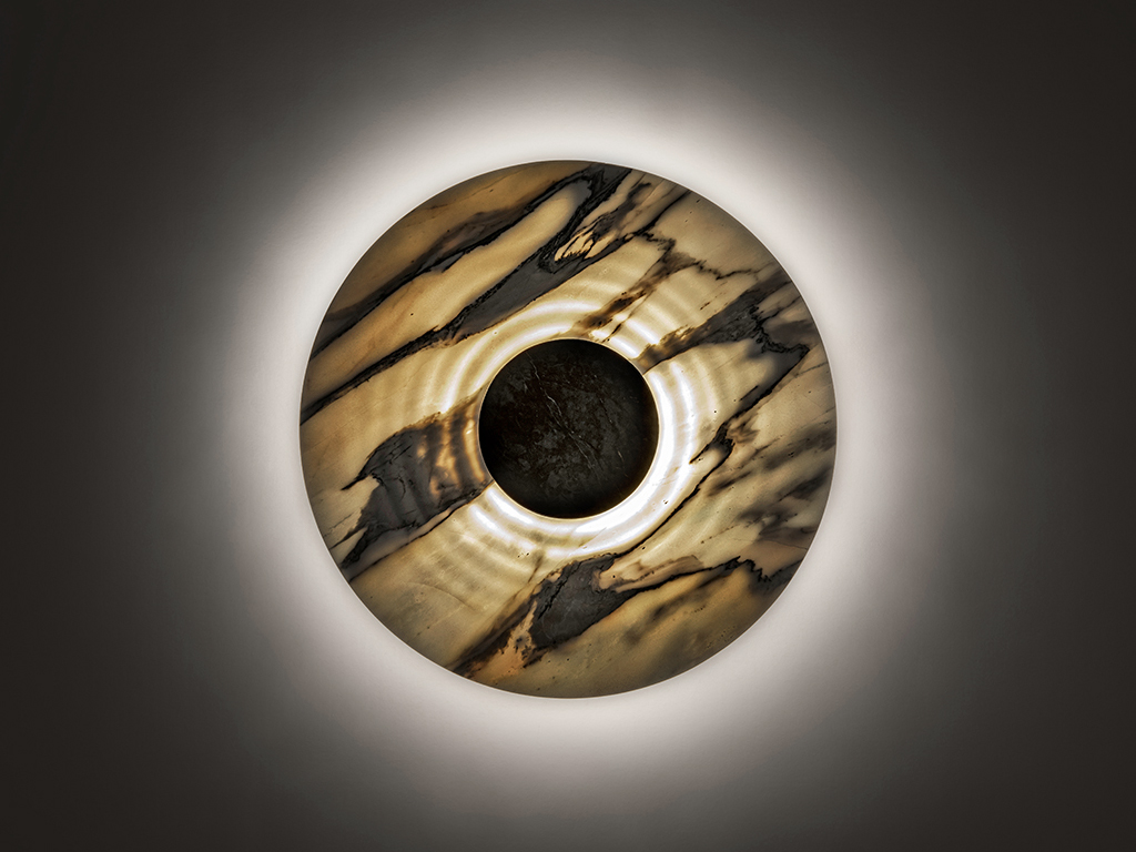 veins of the stone become dark, evoking chaos and mystery beyond the event horizon. When the lamp is off, Messier becomes a sculpture and displays